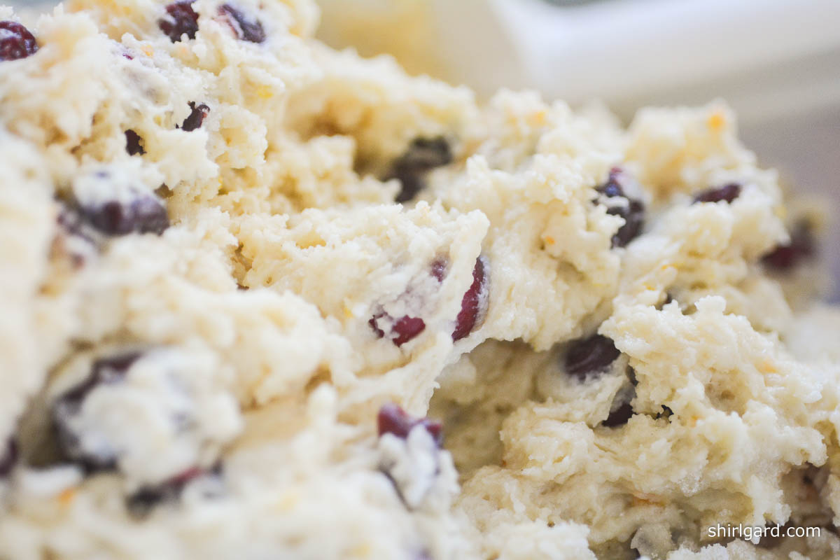 - Pour liquid ingredients into the center of the flour mixture. Fold together with rubber spatula until flour is half absorbed. Sprinkle the cranberries evenly over the top of the batter, then continue folding just until they are well incorporated and all the flour is moistened. Scrape the bottom of the bowl and fold in any loose flour. This batter will be very stiff.