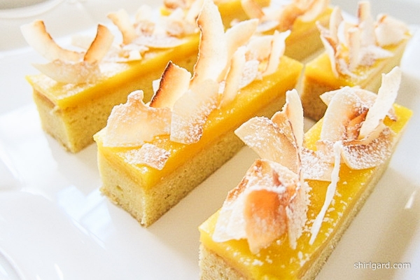 - Lemon Curd & Sablé Breton Bars: 2″ squares with toasted coconut flakes (chips).